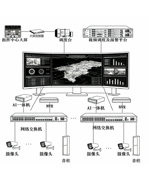 通过部署高分辨率全景相机,配合多模态识别AI模型与计算机视觉分析技术,利用火情识别等AI 算法对现有监控影像拉流抽帧,实现无效视频过滤以减少 90% 以上冗余数据回传,同时通过分析烟雾颜色、厚度、扩散速率等可见光特征,在无红外温感摄像头情况下对火灾进行早期预警,并实时检测未戴安全帽、未穿工作服(反光衣)等违规行为。另可通过视频帧标注关键时间节点及多视角同步回放等实现火灾原因溯源分析。