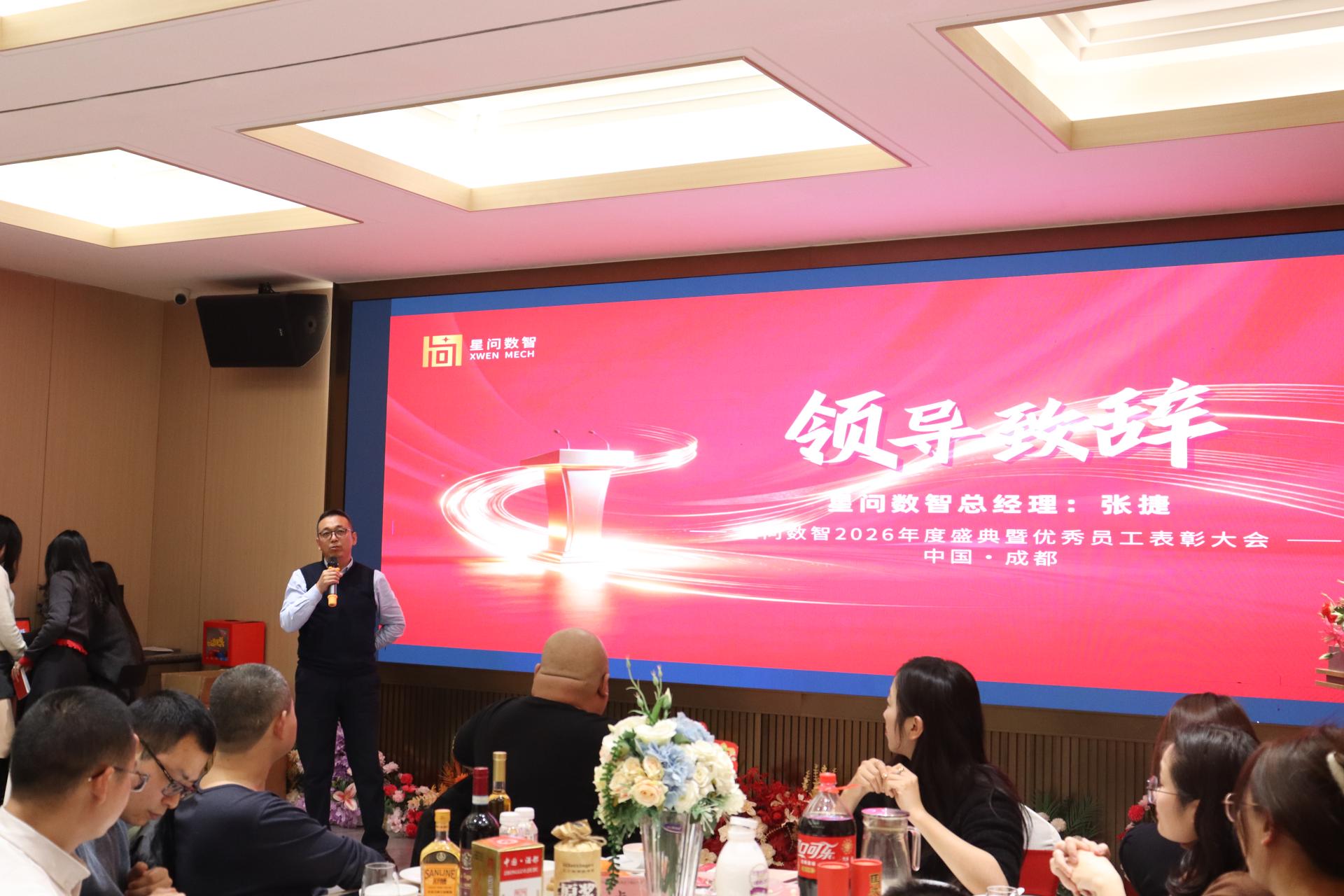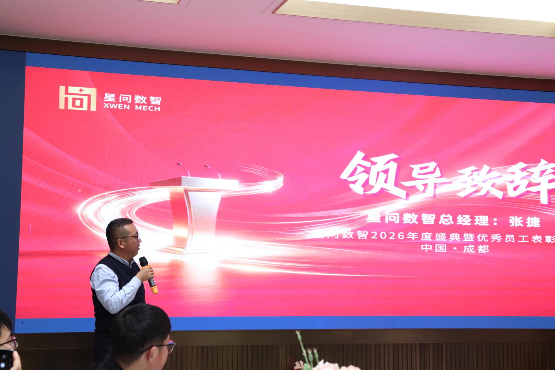 ▎ 在热烈的掌声中,公司总经理张捷登台致辞。他首先感谢全体同仁过去一年的辛勤付出,并回顾了公司在2025年取得的突破性进展:自主研发的AI工业视觉检测系统在多个头部客户产线成功部署,检测精度与效率再创新高;团队规模稳步扩大,核心技术人才持续汇聚;市场版图从酒类拓展至汽车、精密铸造等领域。每一项成绩的背后,都凝聚着星问人的智慧与汗水。